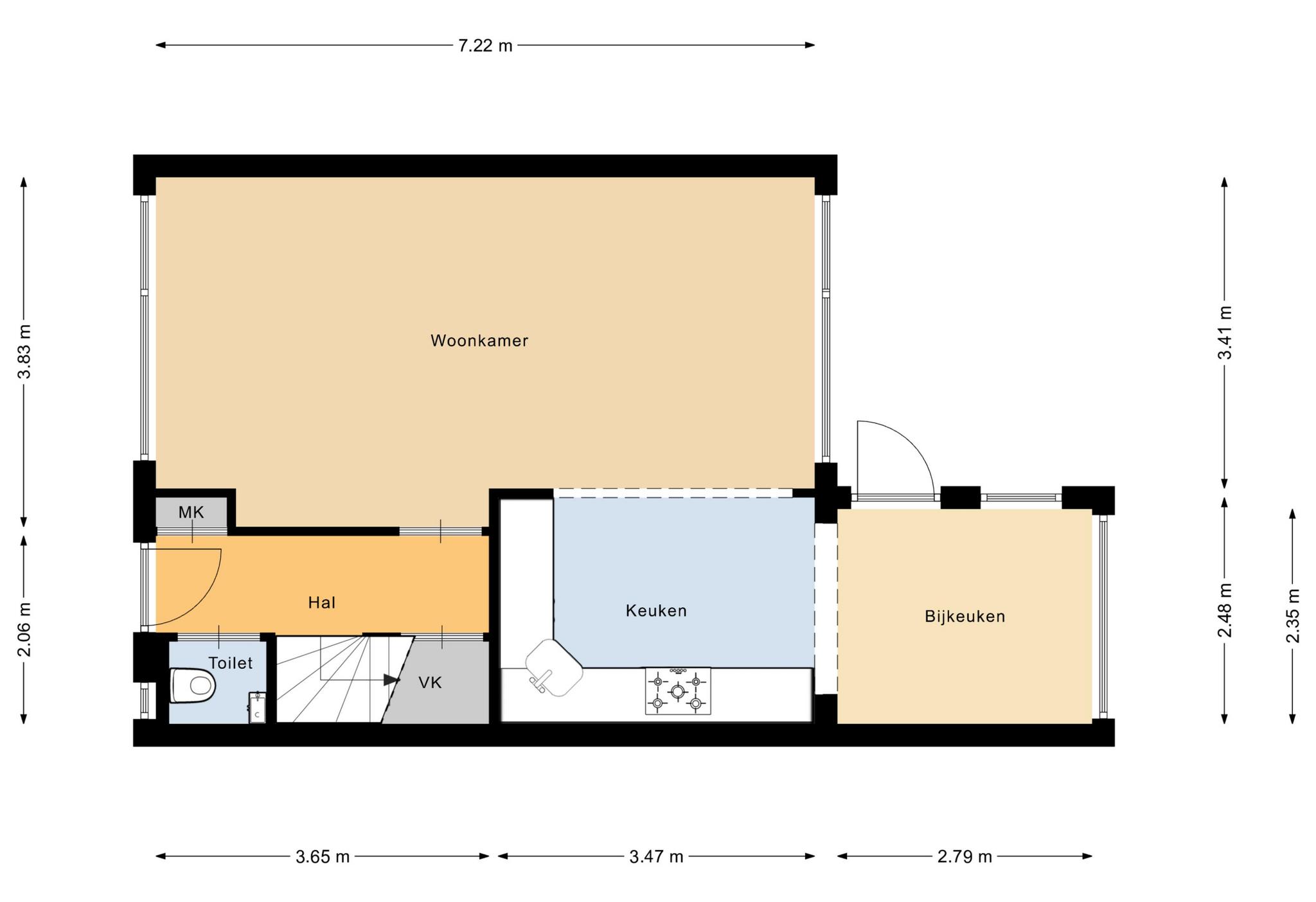Via de entree kom je in de hal met meterkast (vernieuwd in 2008 met krachtstroom en 3-fase aansluiting), een toilet met raam, trapopgang en een praktische trapkast met veel bergruimte. Vanuit de hal stap je de woonkamer binnen.