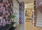 Overdekte entree. Hal met meterkast, royale garderobekast, trapopgang en modern afgewerkte toiletruimte met closet en fonteintje.