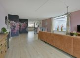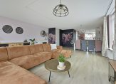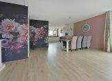 De tuingerichte woonkamer is bij de bouw reeds over de gehele breedte uitgebouwd. De kamer is afgewerkt met glasvliesbehang aan de wanden en een hoogwaardige laminaat vloer.
