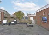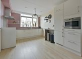 De open keuken is aan de zijde van het woonerf gesitueerd. Er staat een modern keukenblok in een ruime hoekopstelling met lichte kastfronten en een houtlook aanrechtblad. Aan inbouwapparatuur is alles aanwezig: een 5-pits gaskookplaat inclusief wokbrander, een rvs afzuigkap, vaatwasmachine en moderne losse keukenwand met koelkast/ vriezer en oven. Van achter het aanrecht kijkt u door het raam leuk uit over het woonerf. Door het raam in de zijgevel en de grote raampartij/schuifpui aan de tuinzijde is de woonkamer prettig licht.
