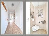 Entree/hal met meterkast, aparte kast voor de warmtepomp, trapopgang naar de eerste verdieping en een keurig betegelde toiletruimte met vrijhangend closet en fonteintje.