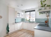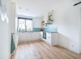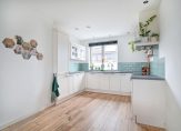 De keuken is gesitueerd aan de voorzijde van de woning en strak uitgevoerd in een U-opstelling. Deze is voorzien van een dubbele spoelbak, vaatwasser, inductiekookplaat, afzuigkap, koel-/vriescombinatie, Quooker-kraan en een combi-oven.