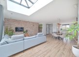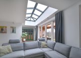 De tuingerichte woonkamer is aan de achterzijde uitgebouwd en voorzien van dubbele openslaande deuren naar de veranda. Boven de uitbouw is een fraaie lichtstraat wat echt een eyecatcher is. Het geeft een luxe sfeer maar zorgt ook voor extra veel licht in de woonkamer. Dankzij de grote raampartijen en het vrije uitzicht aan de achterzijde voelt de tuin als een natuurlijk verlengstuk van de woonkamer. De vloer is afgewerkt met een praktische plavuizen, op de muur zit een fraaie steenstripafwerking en onder de trap bevindt zich een handige trapkast.