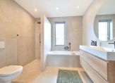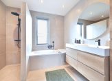 Overloop met toegang tot drie slaapkamers en de badkamer. De badkamer is uitgevoerd in een moderne beige kleurstelling en voorzien van een ligbad, inloopdouche, hangend toilet en een dubbel wastafelmeubel. Deze verdieping is afgewerkt met plavuizen.