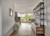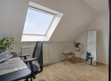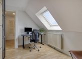 Aan de achterzijde is er een 3e ruime kamer die nu in gebruik is als multifunctionele ruimte met plek voor kasten en een werkplek. Via het grote dakraam kijk je fraai weg richting groen.