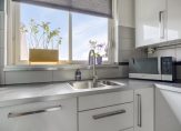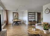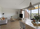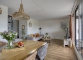 Aan de achterzijde is er een woonkamer met voldoende ruimte voor een goede zithoek en een grote eettafel. Op de vloer ligt een fraaie pvc-vloer met daaronder comfortabele vloerverwarming en de wanden zijn voorzien van stuc.