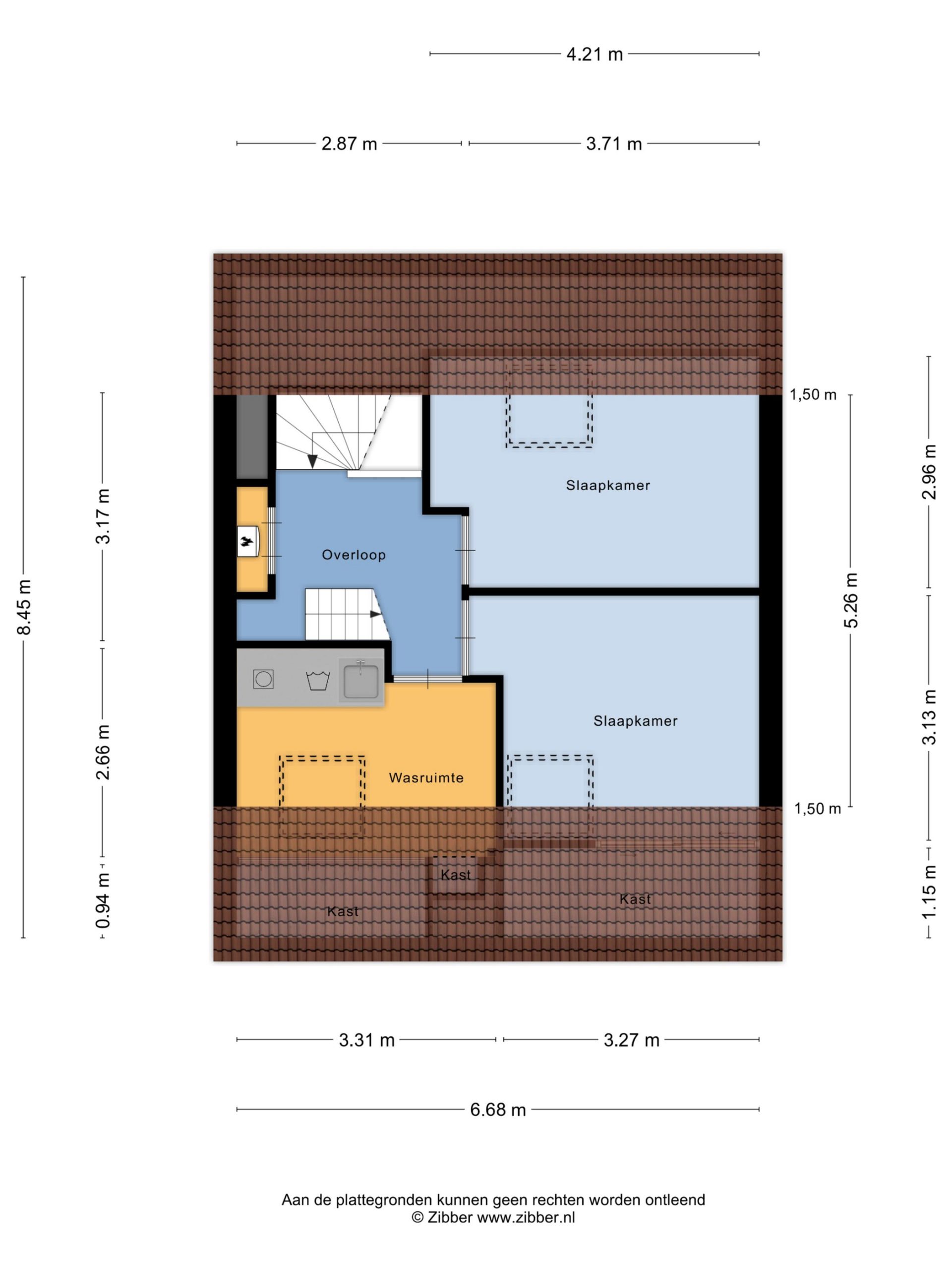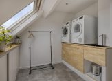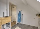 Via een overloop met c.v.-kast kom je in de verschillende ruimtes. Aan de voorzijde zijn er 2 kamers, waarvan 1 ruime slaapkamer met dakraam en een fraaie laminaatvloer met brede planken. De andere kamer is in gebruik als waskamer en beschikt over een vast keukenblok met wasbakje en eveneens een groot dakraam. In beide kamers is er volop bergruimte achter knieschotten.