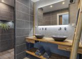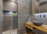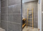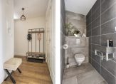 Via de entree kom je direct in een open ruimte met meterkast, ruime trapkast en afgesloten trap naar de bovenste verdieping. De eigenaren hebben de voormalige hal verwijderd, waardoor er een open verbinding is ontstaan tussen de keuken en de woonkamer. Het toilet is een diep en modern afgewerkte ruimte met een wandcloset en een fontein. De naastgelegen badkamer (2016) heeft een moderne en luxe uitstraling door het beton ciré, de keien, de kranen die uit de muur komen, de vloerverwarming en fraaie verlichting in een nis. De badkamer bestaat uit een groot wastafelmeubel met dubbele waskommen en een ruime inloopdouche met bankje en grote regendouche.