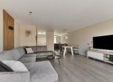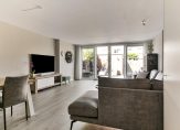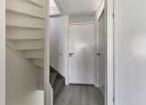 De tuingerichte woonkamer is circa 2 meter uitgebouwd en heeft een grote dubbele glazen schuifpui, die zorgt voor veel lichtinval en een mooie verbinding met de achtertuin. De begane grond is voorzien van vloerverwarming en een nette pvc-vloer, die de ruimte een moderne en verzorgde uitstraling geeft. Onder de trap bevindt zich nog een praktische trapkast.