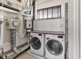Aan de voorzijde van de woning bevindt zich nog de wasruimte. Deze verrassend grote ruimte beschikt naast de aansluitpunten van de wasmachine en wasdroger over de box van de mechanische ventilatie en de omvormer voor de zonnepanelen. In de hoek hangt tot slot de C.V.-ketel (Remeha), welke in 2024 nog nieuw is geplaatst.