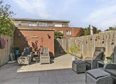 De achtertuin is via de grote glazen schuifpui te bereiken. De achtertuin is gelegen op het noorden en is betegeld met grote grijze tegels en daardoor onderhoudsarm. In de achtertuin bevindt zich een ruime vrijstaande stenen berging met elektra van 7 vierkante meter. Via de poort kunt u tot slot de achtertuin via de achterom verlaten.