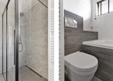 De badkamer is aan de voorzijde van de woning gelegen en is strak en modern afgewerkt. Deze volledig uitgeruste ruimte beschikt over een ruime inloopdouche, een fraai ligbad, een vrijhangend toilet, een groot wastafelmeubel met een spiegelkast en een designradiator.