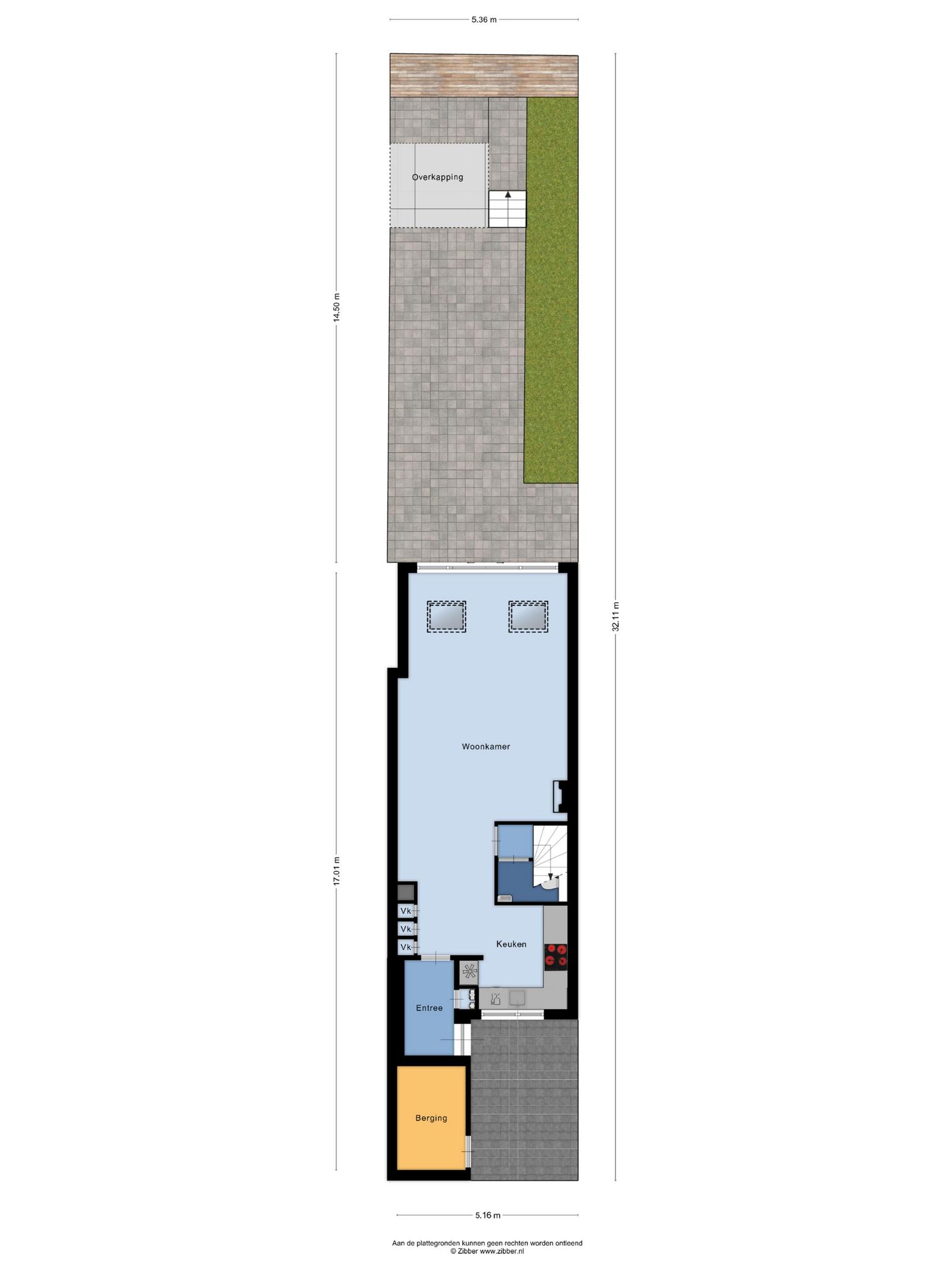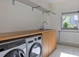 Aan de voorzijde tref je een aangebouwde berging en een eigen parkeerplaats. Met het plaatsen van een laadpaal kun je hier uitstekend je eigen elektrische auto laden. De berging aan de voorzijde heeft door de hoogte een extra bergvliering in de nok. Via de entree kom je in de ruime hal met meterkast met 11 groepen en aardlekschakelaar.