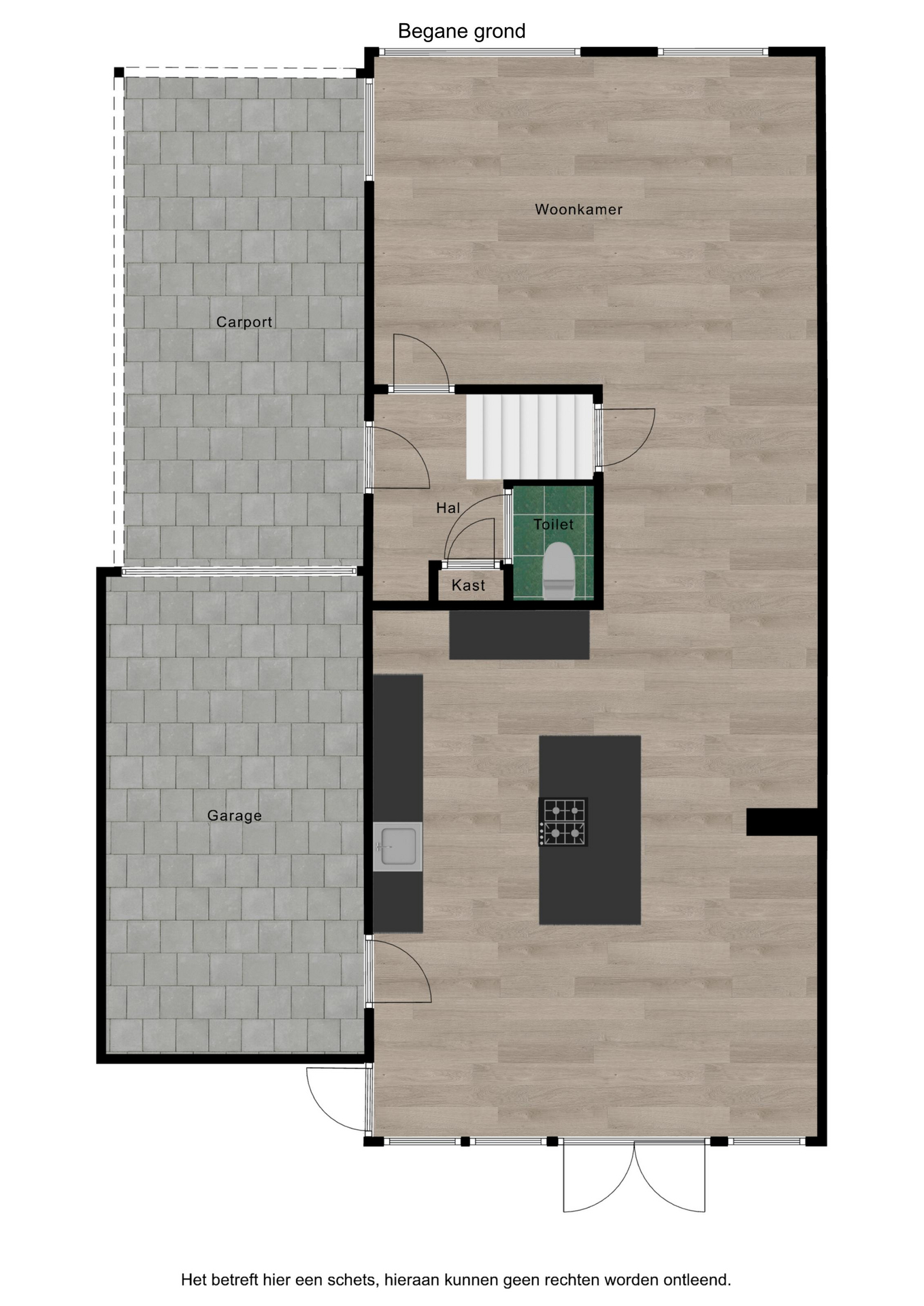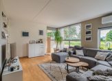 Indeling: entree/hal, toilet, L-vormige woonkamer ca. 30 m² met een fraai uitzicht over het water, met trapkast, woonkeuken ca. 30 m² met kookeiland en openslaande deuren naar de tuin (met overdekt terras). De woonkeuken is voorzien van vloerverwarming. De garage van binnenuit bereikbaar.
