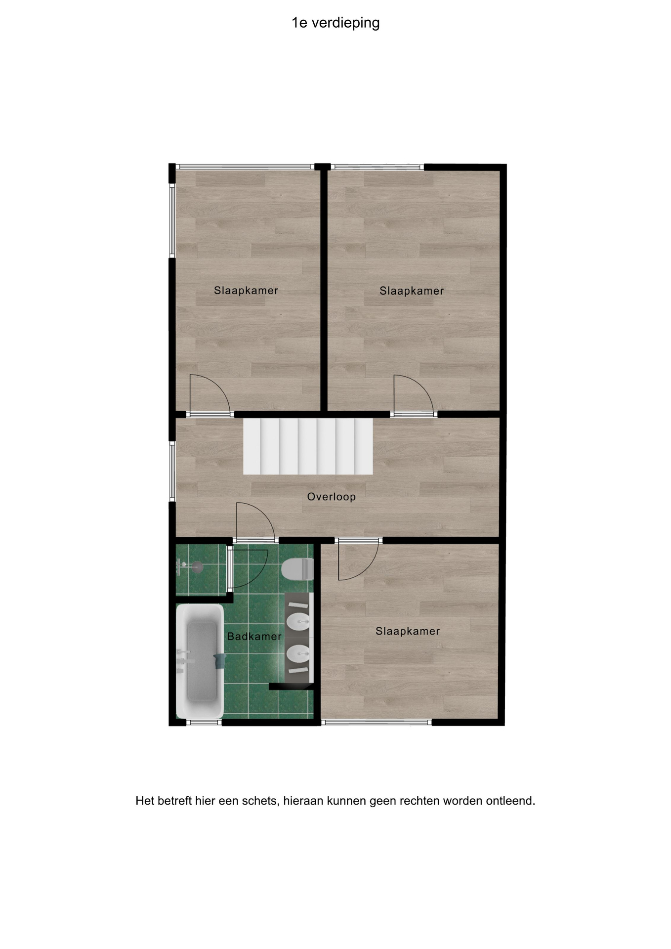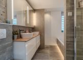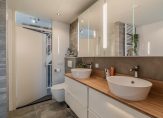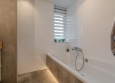 1e verdieping: ruime overloop, 3 slaapkamers ca. 400×290, 400×245 en 295×265. Recent (nov 2021) aangelegde moderne badkamer met ligbad, douche, wastafelmeubel met twee waskommen en 2e toilet.