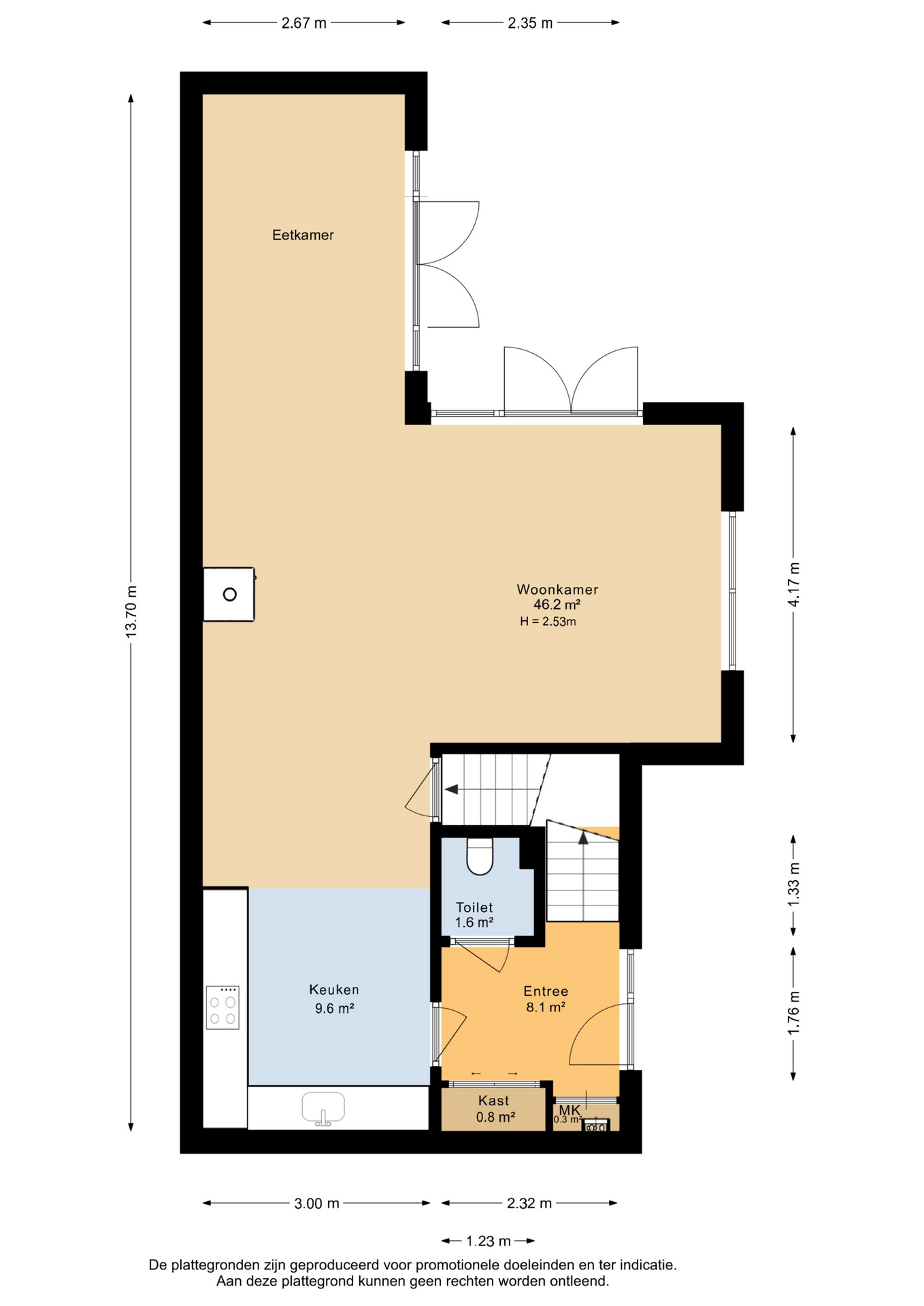 Achter de voordeur wacht een warm welkom. De entree is voorzien van een ruime garderobekast met dubbele deuren, waarin je meer dan voldoende opbergruimte vindt. Daarnaast bevinden zich hier de trap naar de eerste verdieping, de meterkast en een keurig toilet. Vanuit de entree loop je door naar de open keuken aan de voorzijde van de woning. Deze keuken, uitgevoerd in een lichte kleurstelling en voorzien van diverse inbouwapparatuur, vormt het hart van het huis. De ruimte loopt vlekkeloos over in de eet- en woonkamer, waardoor een heerlijk open en luchtige leefruimte ontstaat.