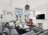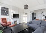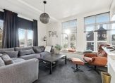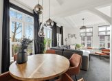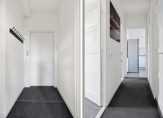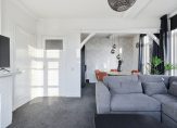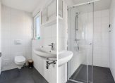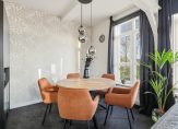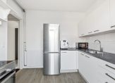 Aan de andere zijde van het appartement is de dichte keuken, waar een lichte hoekopstelling staat. De kasten boven het aanrecht, de lades en onderkasten bieden genoeg bergruimte en het inductiefornuis met oven blijft achter, net als de afzuiging in de schouw. Naast de keuken is een inbouwkast, waar de wasmachine of was-/droogcombinatie kan staan.