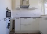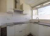 Aan de galerijzijde is de dichte keuken met hoekopstelling. Er is een doorgang naar een ruimte waar de wasmachine en een vriezer staan.