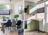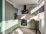 In veel woningen zie je een witte, grijze of zwarte keuken. Maar hier niet! Deze keuken in een hoekopstelling (2022) is uitgevoerd in een fraaie groene kleur, met zwarte accenten en een houtlook wandafwerking. Alle benodigde apparatuur is ingebouwd: een inductie kookplaat (2023), afzuigkap, oven, vaatwasser, koelkast en een vriezer.
