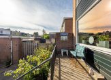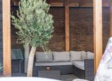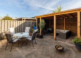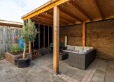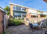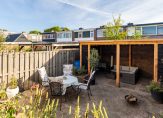 Met een hapje en een drankje loop je zo vanuit de keuken het terras op, dat via een trap van enkele treden in verbinding met de tuin staat. De ligging op het oosten zorgt vooral in de ochtend en middag voor fijne zon. Schaduw is er ook, onder de houten veranda die naast de garage is gebouwd. Er is een eigen achterom, van de tuin naar de oprit waar meerdere auto’s kunnen staan.