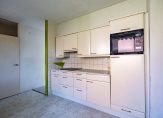 Achter het muurtje is de keuken, waar aan twee kanten een lichte wandopstelling staat. De keramische kookplaat, afzuigkap, koelkast en combimagnetron zijn ingebouwd. Nu is het een dichte keuken, maar een halfopen keuken of open keuken is ook mogelijk.