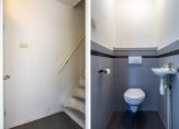 Naast de keuken is een portaal met de trap naar de eerste verdieping. Ook de toiletruimte is hier, met een wandcloset en een fonteintje. De muren zijn deels betegeld en op de vloer liggen dezelfde tegels als in het portaal.