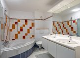 In de badkamer zijn oranje, rode, blauwe en witte tegels gecombineerd tot een vrolijk geheel. Het hoekbad kan tevens als douche worden gebruikt en de rest van de badkamer is ingedeeld met een toilet, een dubbel wastafelmeubel en een grote spiegel.