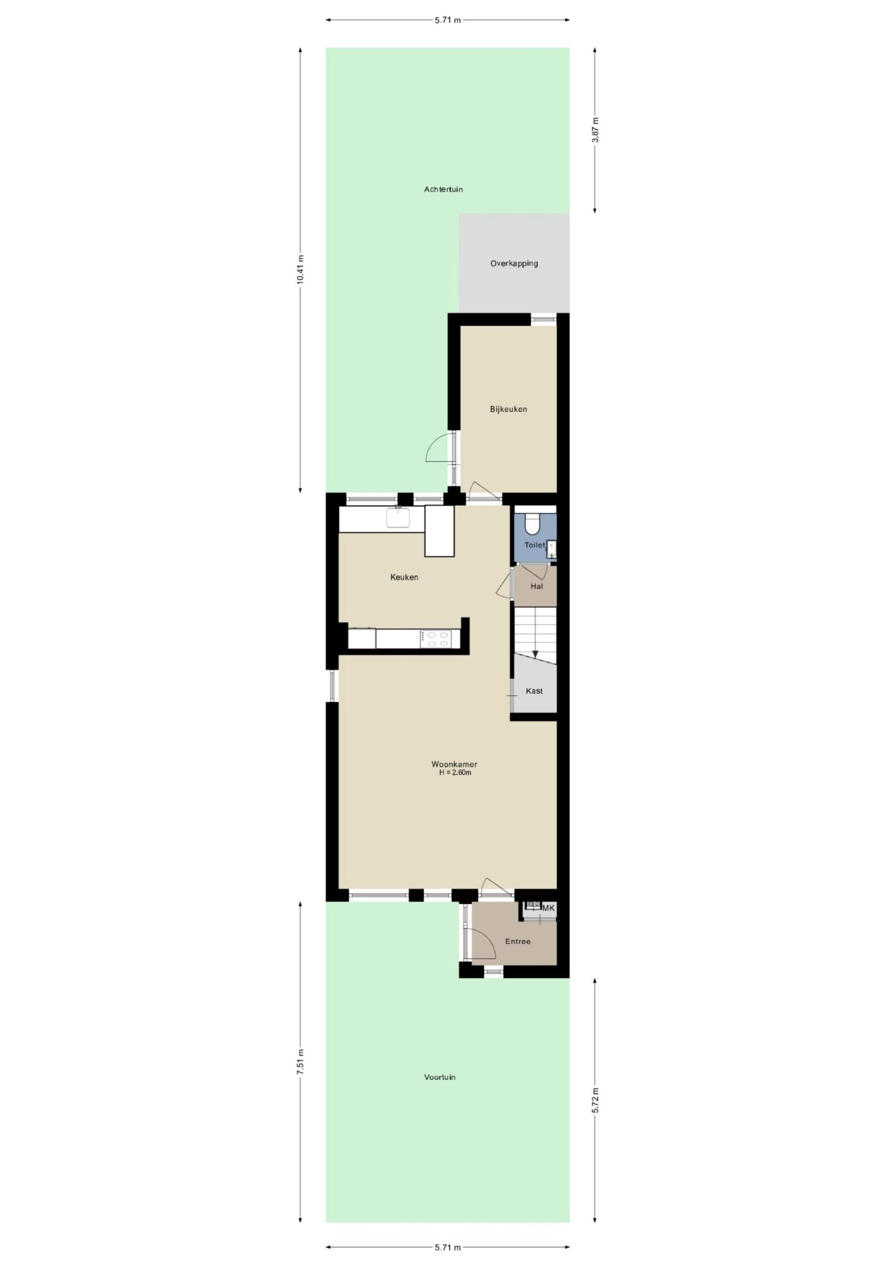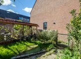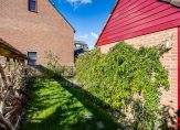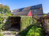 Via de bijkeuken/berging is de achtertuin te bereiken, op het zonnige westen. Er is veel groen in de tuin en via het poortje is de steeg te bereiken. De fietsen kunnen dus in de berging of onder de overkapping staan. Ook is er een leuke voortuin, naast de oprit en het pand naar de voordeur. Aan de linkerzijde is een stuk grond in gebruik van de gemeente.