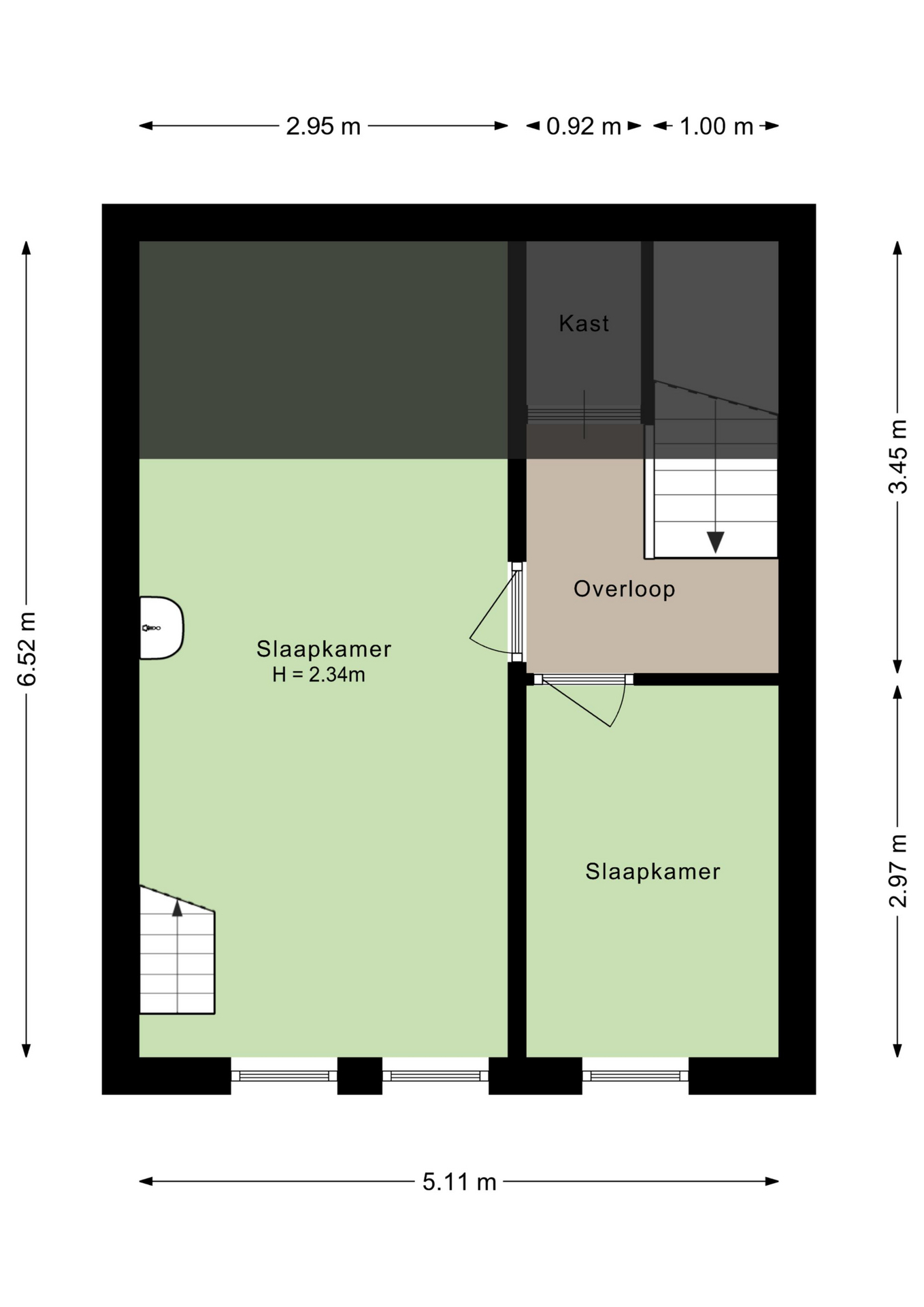 Een vaste trap geeft toegang tot de tweede verdieping. Hier zijn een overloop en twee slaapkamers, waarvan een met een wastafel en een vliering. Hiermee heeft deze woning meer dan genoeg ruimte voor een gezin en om vanuit huis te werken.