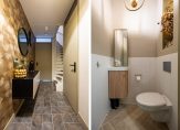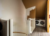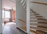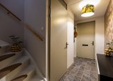 Warme, mooie kleuren bepalen de sfeer in de ruime hal. Bij de meterkast is meer dan genoeg ruimte voor een kapstok en op de lange muur zie je stijlvol behang, dat goed past bij de tegelvloer. Rechts in de hal is niet alleen de meterkast, maar ook de trapopgang en de toiletruimte.
