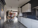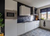 Vanaf de eettafel loop je zo de keuken in, waar een lichte wandopstelling staat. De gaskookplaat, afzuigkap, vaatwasser, magnetron en koelkast zijn ingebouwd. Liever een keuken met meer bergruimte? Een mooie hoekopstelling is mogelijk, net als een U-opstelling of een dubbele wandopstelling. En vergeet niet om het uitzicht te bewonderen, naar de brede en rustige straat.