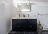 De badkamer, met lichte wandtegels en donkere vloertegels, is heel licht en ruimtelijk. Aan de rechterzijde hangt een badmeubel met twee wastafels en verder zie je een wandcloset, een inloopdouche met glazen wand en een zwarte thermostaatkraan met dubbele douchekop.