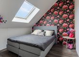 Ruimte is er in overvloed, ook op de tweede verdieping die deels is ingedeeld. Uiteraard is er een vaste trap, voor een optimale bereikbaarheid, en aan de voorzijde is een groot dakraam geplaatst. Hier is de vierde slaapkamer, met kleurrijk behang op de muur achter het bed.