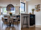 Grote ramen aan drie zijden zorgen voor veel lichtinval en bij het zitgedeelte, aan de achterzijde, is een deur naar het dakterras. Het eetgedeelte grenst aan de luxe keuken, ingedeeld met een wandopstelling en een kookeiland. Het eiland biedt ruimte om te koken en om te zitten, het spoelgedeelte is aan de andere zijde en alle benodigde apparatuur is ingebouwd: een inductie kookplaat met afzuiging, een vaatwasser, combi-oven, koelkast, vriezer en een wijnklimaatkast.