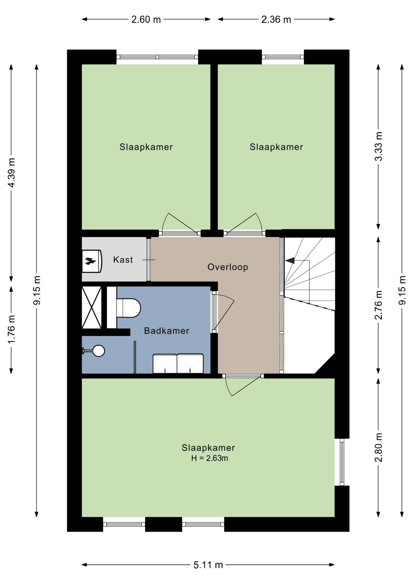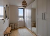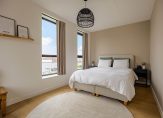 Aan de voorzijde is de master bedroom, over de hele breedte van het huis. De slaapkamers aan de achterzijde zijn ingericht als kleedruimte en werk-/logeerkamer. In de badkamer, te bereiken vanaf de overloop, word je omringd door luxe en stijl. De ruimte is ingedeeld met een inloopdouche, wandcloset en een tweepersoons wastafelmeubel. Ook aan details is gedacht; twee houten planken boven het toilet, een fraaie douchedeur en een spiegel met verlichting.
