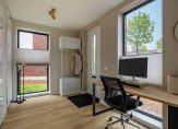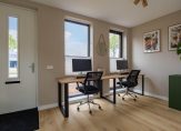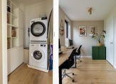 De entree aan de voorzijde geeft toegang tot een royale, lichte werkkamer/kantoorruimte. Dankzij de hoekligging heeft deze kamer grote ramen aan twee zijden. De aangrenzende berging biedt onder andere ruimte aan de wasapparatuur.
