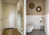 Op de bovenste verdieping zijn een royale overloop, drie slaapkamers, de badkamer en een berging/technische ruimte. Qua wand- en vloerafwerking zie je dezelfde stijl als op de eerste verdieping. Fraai element is de glazen wand met schuifdeur, die het trapgat afsluit van de overloop.
