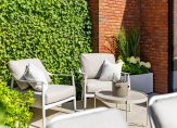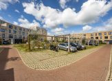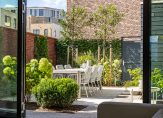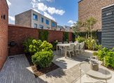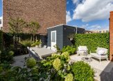 Openslaande deuren geven toegang tot de fraai aangelegde tuin op het westen. Bestrating in verschillende formaten is gecombineerd met planten, struiken en leibomen. In de berging kunnen de fietsen staan en via de poort is het binnenterrein, met een toegewezen plek voor de auto, te bereiken.