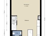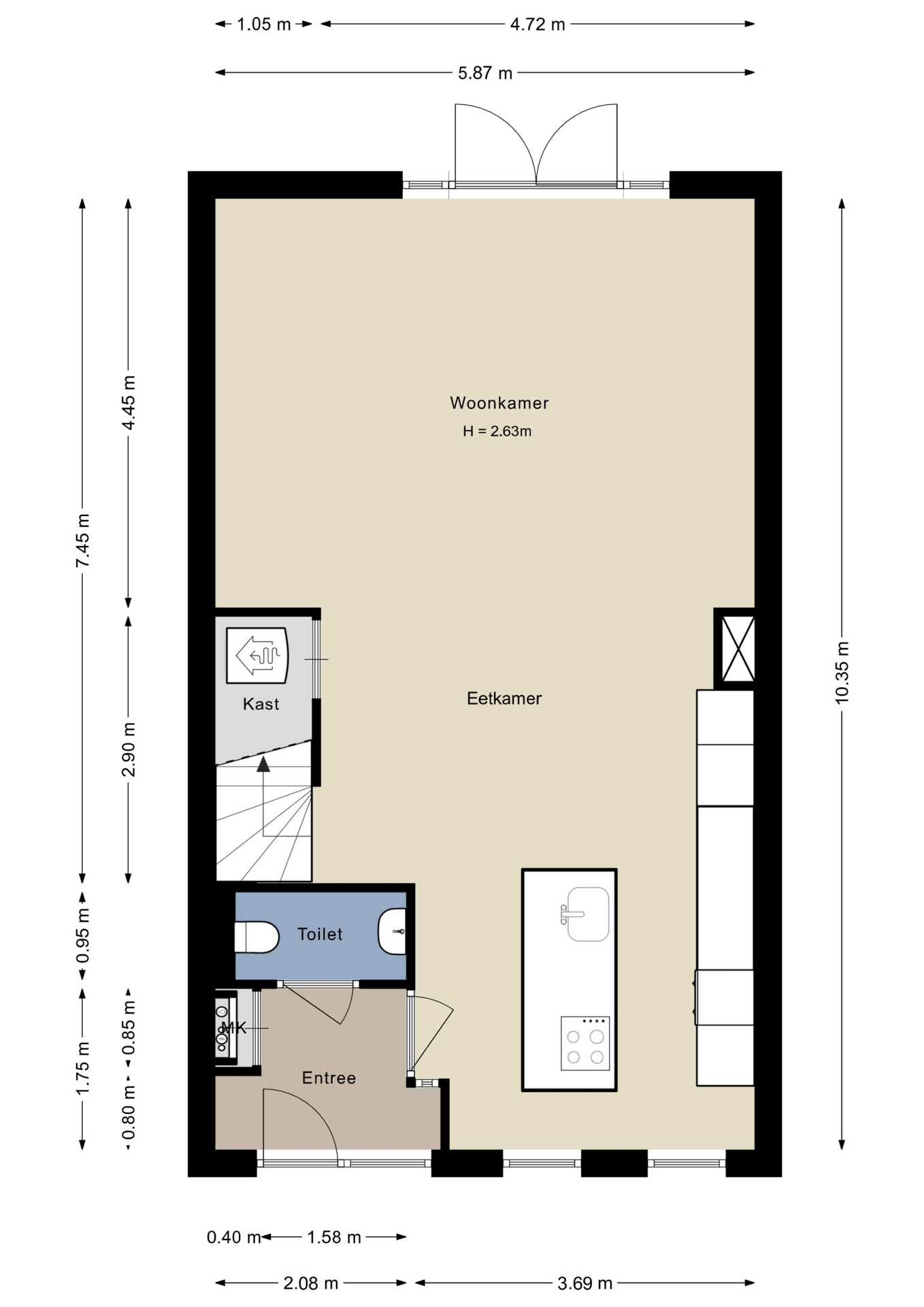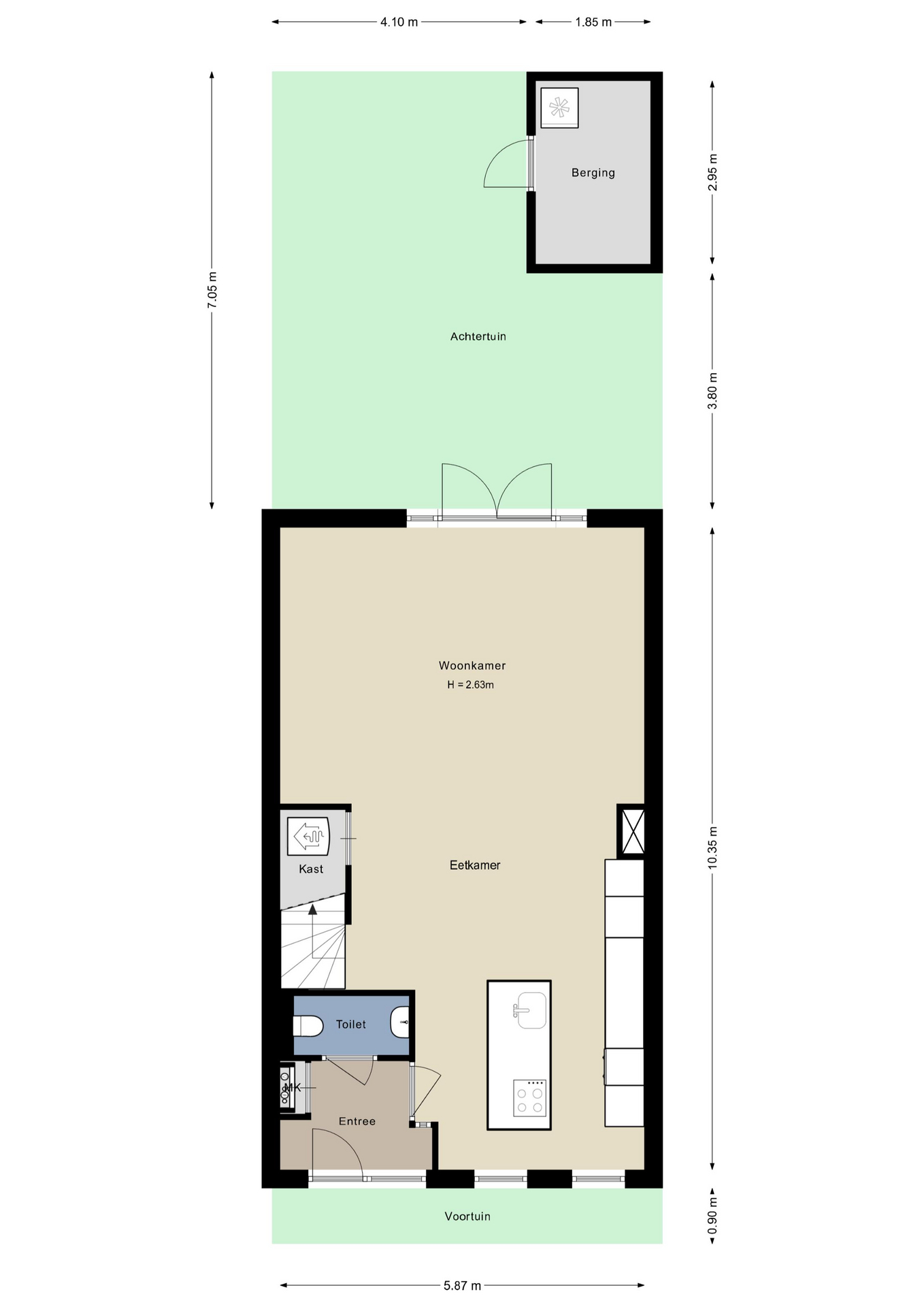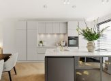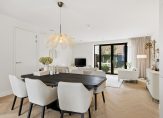 Een fraaie deur met glas verbindt de hal met de keuken, die in open verbinding met de woonkamer staat. Je oog valt op de lichte visgraatvloer, de exclusieve keuken met eiland en de pui met openslaande deuren naar de tuin. Het zitgedeelte heeft een breedte van bijna 5.90 meter en het eetgedeelte is groot genoeg voor een 6-persoonstafel.