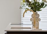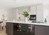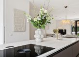 De keuken, met een kook-/spoeleiland en een grote kastenwand, is uitgevoerd in een fraaie kleurencombinatie. De goudkleurige Quooker kraan, het witte aanrechtblad en de kasten met glazen deuren zijn details die het verschil maken.