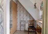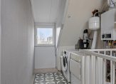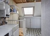 Een vaste trap geeft toegang tot de tweede verdieping, met een grote dakkapel aan de voorzijde. De eerste ruimte is de overloop met de HR-ketel en de aansluitingen voor de wasapparatuur. In de nok is een vliering gemaakt en ook in de schuinte van het dak is praktische bergruimte.