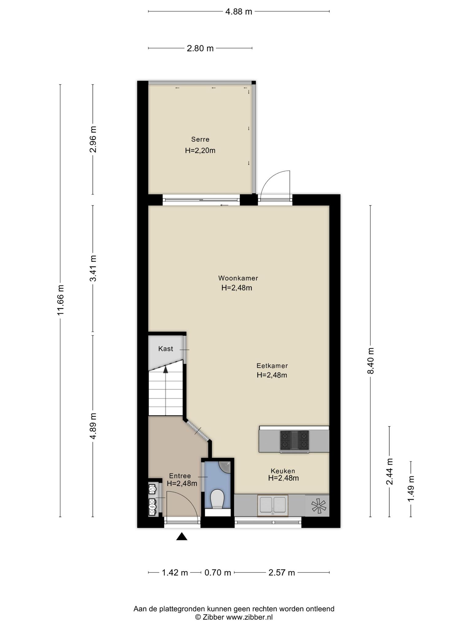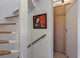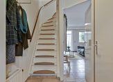Achter de grachtengroene voordeur is de hal, met de meterkast en de trap naar de eerste verdieping. Naast de meterkast is plek voor een kapstok en aan de andere zijde is de toiletruimte, ingedeeld met een wandcloset en een fonteintje.
