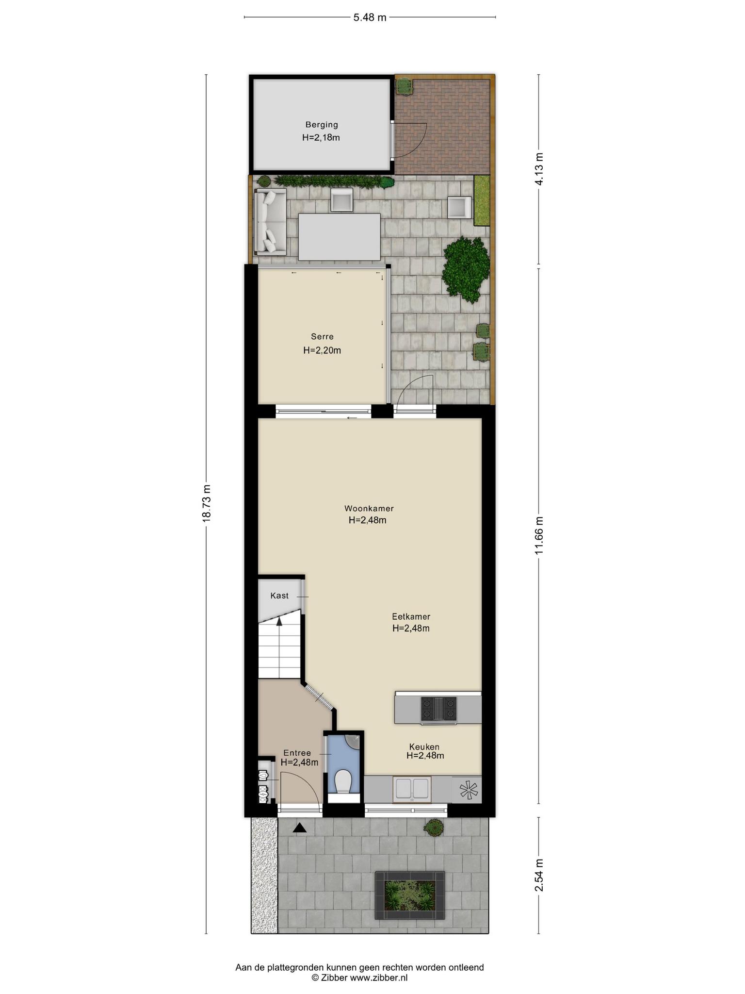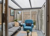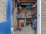 Grote, vierkante tegels maken de voortuin optisch een stuk groter. Ook voor de achtertuin, op het zonnige westen, heb je geen groene vingers nodig. Als je de schuifdeuren van de serre opent, dan zijn de tuin en serre één geheel. De serre kan standaard als buitenruimte gebruikt worden en is eventueel ook te verwijderen, deze is op stenen klinkers gebouwd. De stenen berging biedt ruimte aan de fietsen en heeft, heel handig, een achterom.