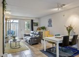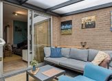 De gezellige woonkamer staat niet alleen in verbinding met de tuin, maar ook met een lichte serre. In de woonkamer is genoeg plek voor een grote zithoek, tv-meubel en de eettafel. Ook aan bergruimte is gedacht, want in de trapkast kun je veel spullen kwijt. Een schuifpui verbindt de woonkamer met de serre, ingericht als zitkamer.