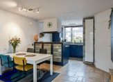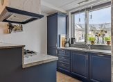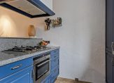 Aan de voorzijde is de halfopen keuken, met stijlvol aanrechtblad van graniet. Nu is de keuken blauw, maar het is mogelijk om met restyling voor een andere kleur te kiezen. De gaskookplaat, afzuiging, oven, koelkast en vaatwasser zijn ingebouwd.