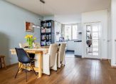 Wat een geweldige ruimte is de woonkamer, met een meer dan 4.50 meter lange uitbouw aan de achterzijde. Wat opvalt zijn het hoge plafond en de grote pui met openslaande deuren, die ervoor zorgen dat het daglicht volop naar binnen valt. Het zitgedeelte is aan de tuinzijde en het eetgedeelte is in het oorspronkelijke deel van de woonkamer.