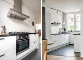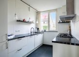 Aan de voorzijde is de keuken, met een donkere tegelvloer en lichte tegels op de muren. De ruimte is ingedeeld met een dubbele wandopstelling (2018), beiden met een aanrechtblad van zwart natuursteen. Alle benodigde apparatuur is ingebouwd: een 5-pits gaskookplaat, afzuigkap, oven, vaatwasser (2023), koelkast en een vriezer.