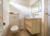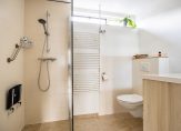 Rond 2010 is de badkamer vernieuwd, uitgevoerd in mooie kleuren en met stucwerk op een deel van de muren. De ruimte is ingedeeld met een inloopdouche, wandcloset en een wastafelmeubel.