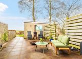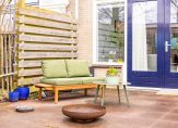 Aan de voorzijde is een smal tuintje, op het oosten. Dit betekent dat de achtertuin een uitstekende zonligging heeft, op het westen. Een groot deel van de tuin is bestraat en in de stenen berging is ruimte voor de fietsen. Achter de berging is een stukje tuingrond bijgekocht, waar je op het gras een tuinset kan neerzetten om van het uitzicht te genieten.