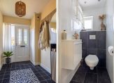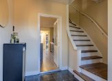 Wat een fraaie uitstraling heeft deze woning, met witte buitengevels en een rood pannendak. Aan de kant van de Deventerweg is de entree, met een klassieke voordeur die toegang geeft tot de hal. De sfeer wordt bepaald door de tegelvloer, het ‘glas in lood’ in de voordeur en de bordestrap naar de eerste verdieping. Aan de rechterzijde is de toiletruimte, ingedeeld met een wandcloset en fonteintje.